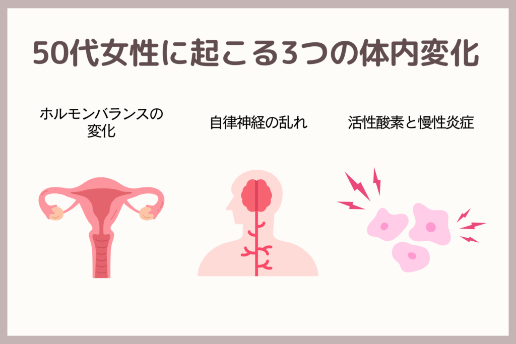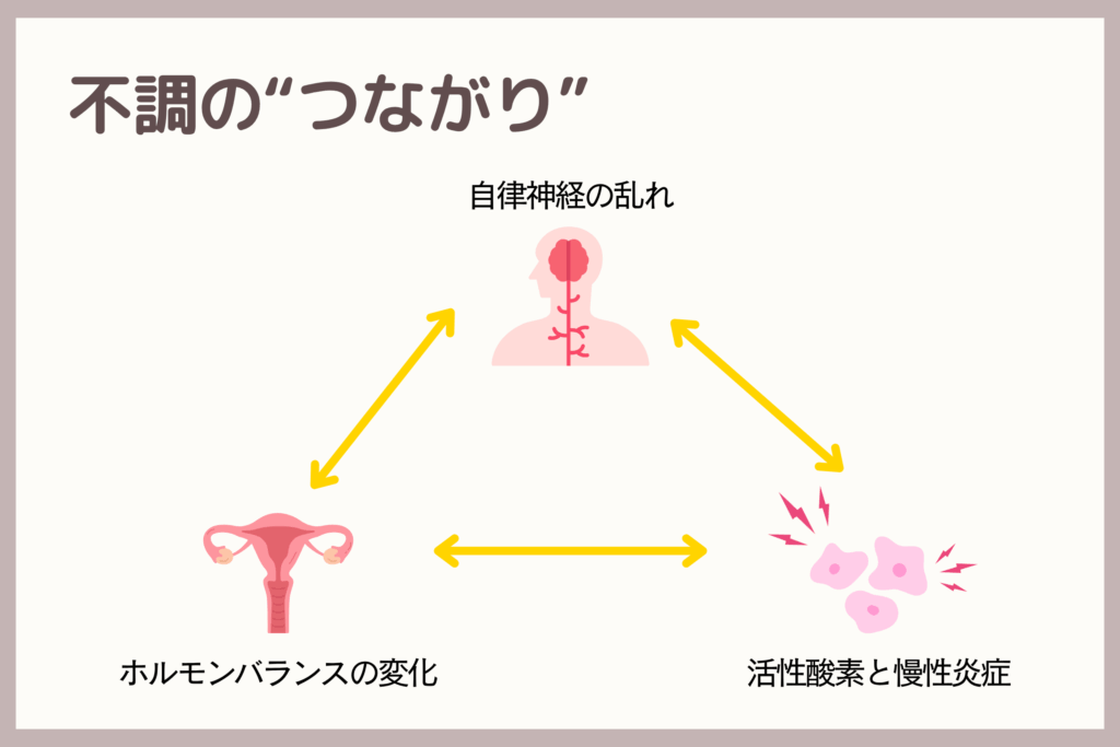 「ホルモンバランスの変化」「自律神経の乱れ」「活性酸素や慢性炎症」。