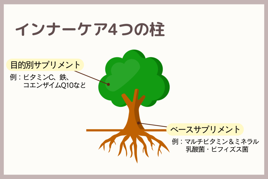 サプリメントの選び方を「木」に例えると、幹や根っこにあたるのが、マルチビタミン&ミネラルや、腸内環境を整える乳酸菌・ビフィズス菌などのベースサプリメントです。