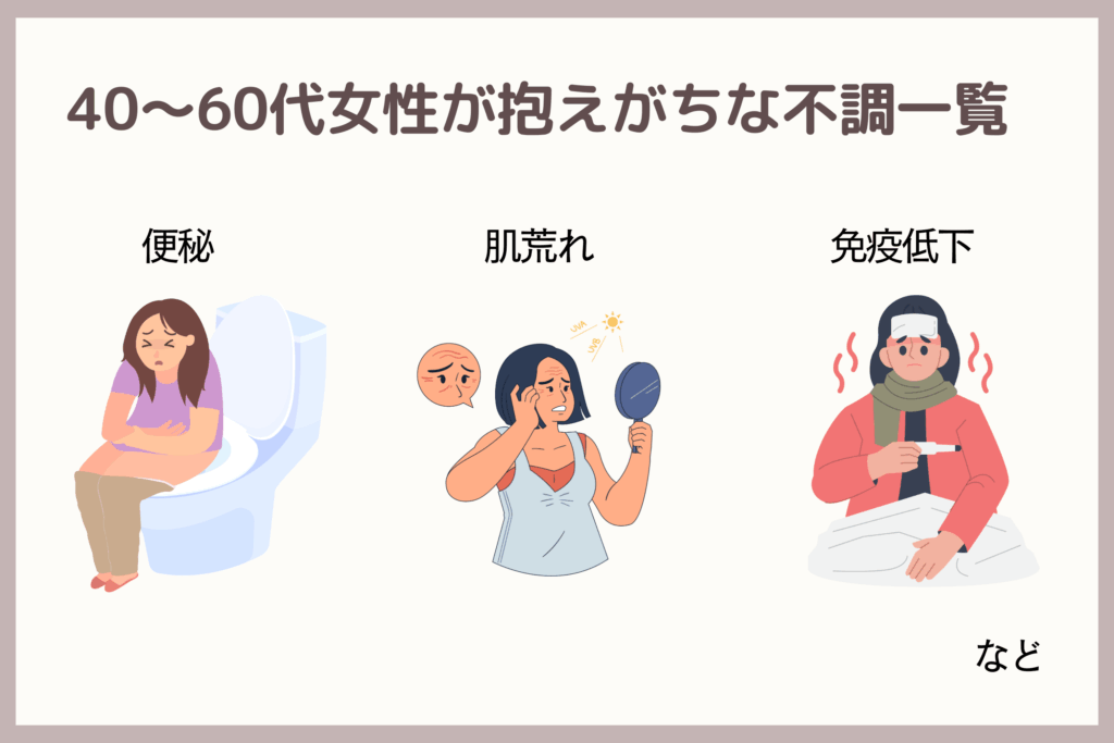 50代前後になると、体調や肌の変化を感じる方が増えてきます。便秘がちになったり、風邪をひきやすくなったり、肌荒れが治りにくくなったり……。