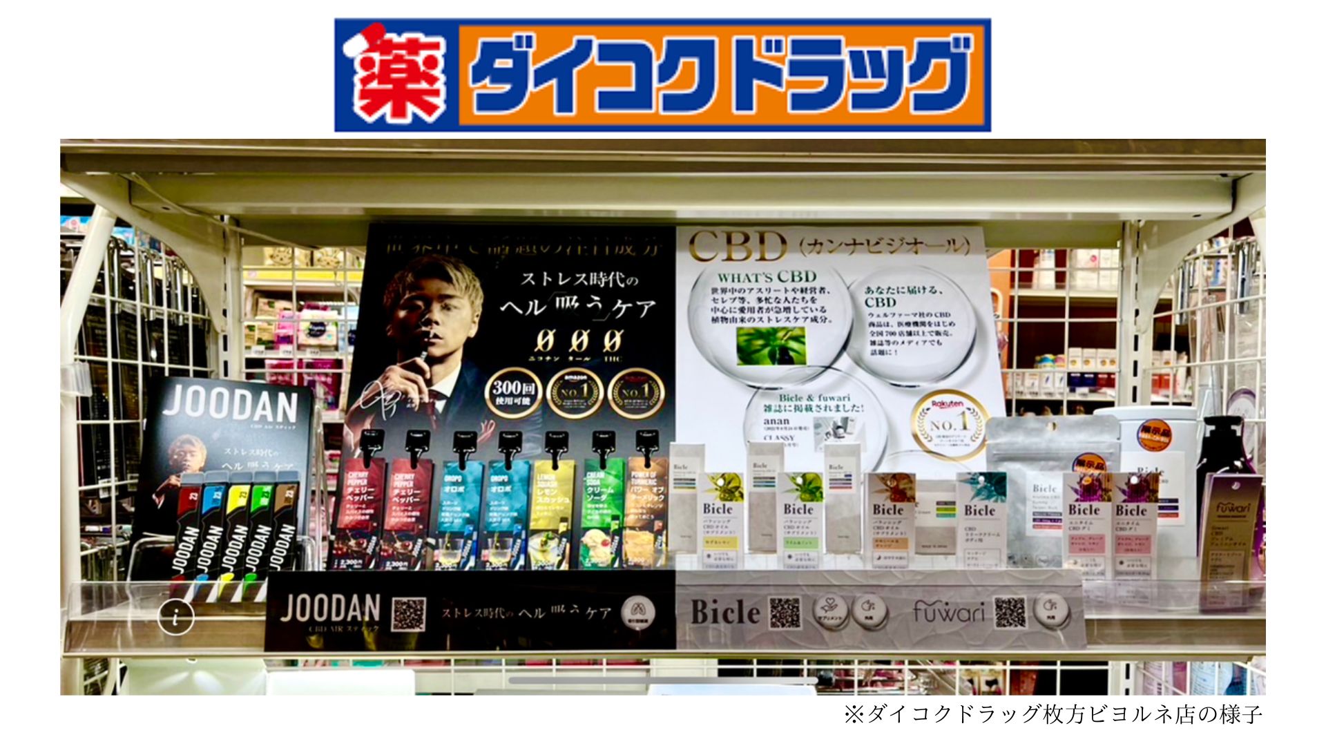 そしてこの度、2023年3月9日より、関西の一部ダイコクドラッグ店舗様にて、当社3ブランド(Bicle・fuwari・JOODAN)のCBD商品のお取り扱いがスタートしました。